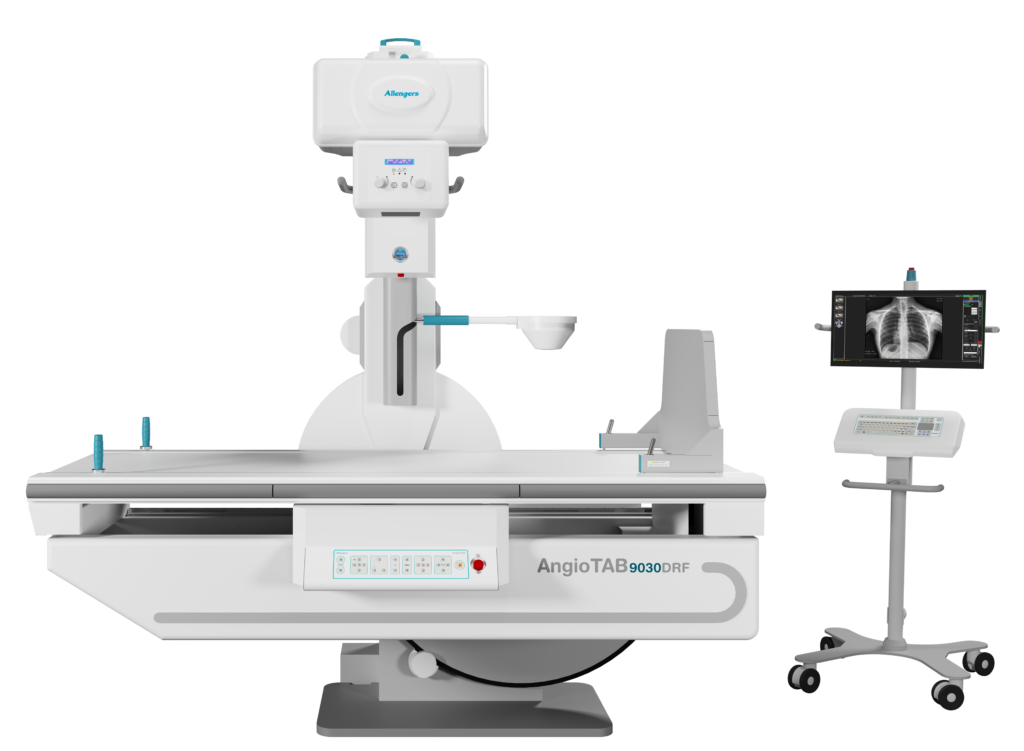 The Allengers AngioTab 9030 is a Digital Radiography and Fluoroscopy (DRF) system designed for advanced diagnostic imaging. It is a remote-controlled RF device that integrates a dynamic flat panel detector (FPD) and supports Digital Subtraction Angiography (DSA) as an optional package.